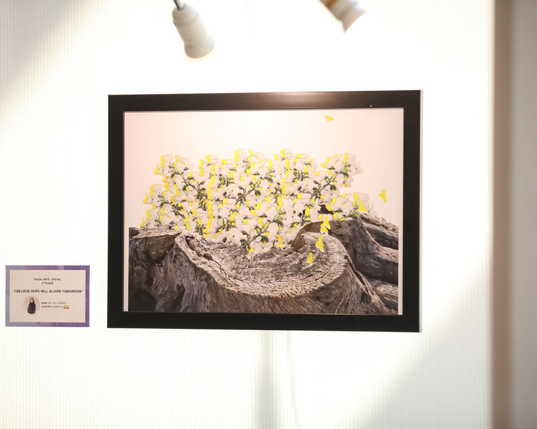 HSUさんは、日本・大洲城で撮影した古い木の幹の写真を元に、母国ミャンマーの国花であるパダウ(Padauk)と、鳥のイメージを組み合わせて作品を制作しました。作品の中の黄色は、パダウの花の色であり、多くの文化で幸福を表す色であるとして、希望と再生の象徴として用いられています。審査員からは、自然物を組み合わせて平和や共生への願いを象徴的に表現した点が、特に高く評価されました。
