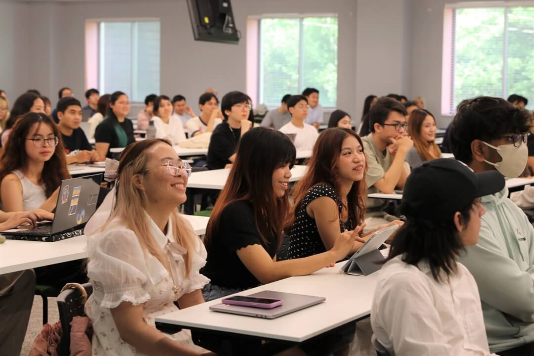 阿志さんはAPU卒業後、日本で自動車メーカーに入社し、現在は世界展開するアパレル製造小売業で働いています。卒業後はずっと日本企業に勤め、講義でも流ちょうな日本語でお話された阿志さんですが、APU入学時は日本語を全く話せず初級クラスで学び始めたそうです。講義では、日本での就職を視野に入れる受講生たちに向けて、日本語での就活や働きかたについて、実体験を交えた有益な助言が伝えられました。就職活動中の面接では日本語の意味がわからないこともあるが、素直に単語の意味を質問することで、相手も専門用語を使ったことに気付くことができ、円滑なコミュニケーションを生み出せるという具体的なアドバイスもありました。
