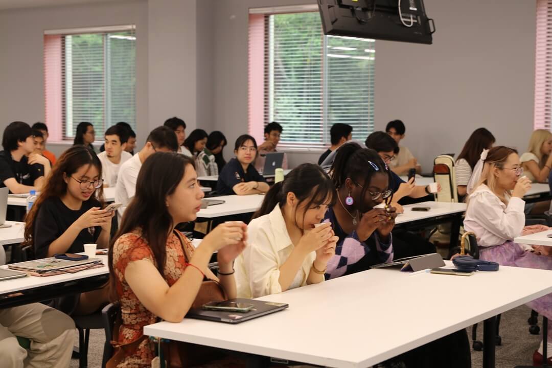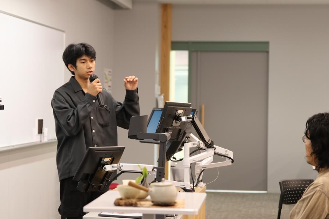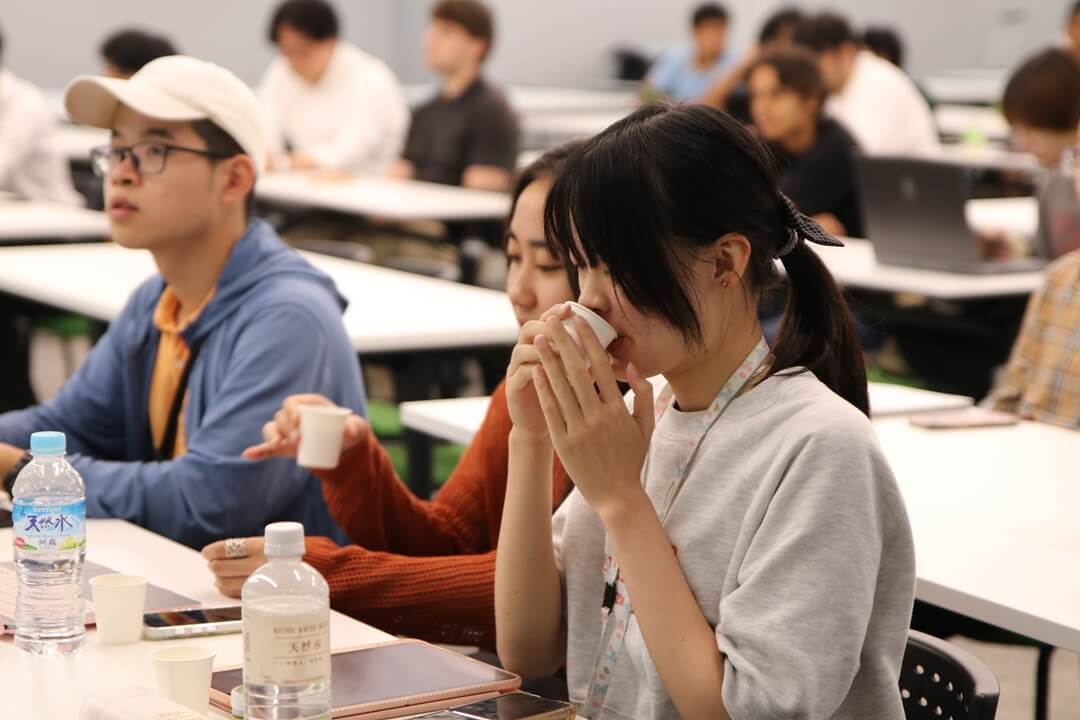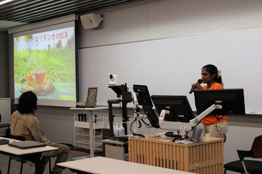 講義の最後には複数名の国際学生が、スリランカやインド、バングラデシュなど、自身の出身国のお茶とそれにまつわる文化を紹介しました。お茶を囲み、老若男女問わず政治などについて語り合うという文化の紹介に、牧野さんは「日本と同じですね」と関心を寄せられました。講義内では中上級コース担当教員から杵築市の緑茶とバングラデシュ産の紅茶などがふるまわれ、学生は急須で煎れたお茶の旨味を堪能しました。
