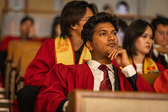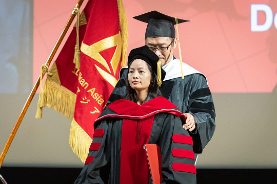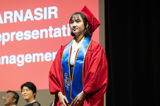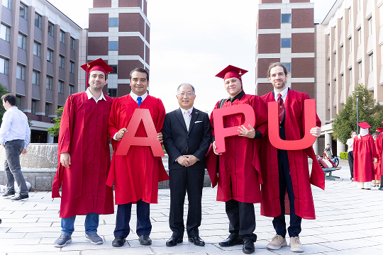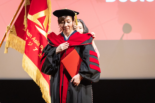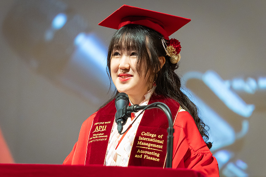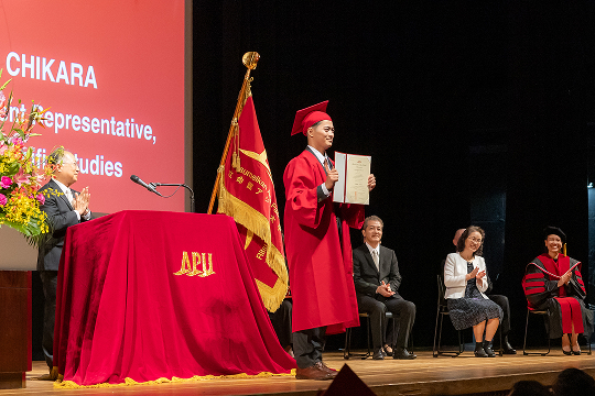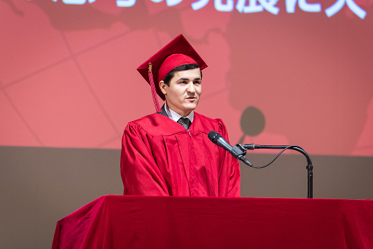 大学院修了生を代表してRUSTAM ABDUQAYUMさん(アジア太平洋研究科、タジキスタン)は、「これまでの自身の歩みを振り返ると、揺るぎない忍耐と学問への献身が、私にとって良い思い出となっています。私たち一人ひとりが独自の道と経験をすでに有していましたが、私たちを結びつけたのは学問的成長と自己研鑽への強い意志でした。APUに入学したとき、キャンパスはその立地から孤立しているように思えました。当初、別府は温泉で有名な町という程度の印象でしたが、すぐに真の温泉はAPUの教室で沸き立つ「アイデア」だと気づきました。年月を重ねるにつれ、APUの中心は世界中から集まる学生であり、それぞれが独自のアイデア、知識、そして学びへの強い意欲を持っていることを実感しました。私たちは共に議論、友情、協力の場を築き、世界的な発展の架け橋を築く土台を作ったのです。APUは私たちに自分の強みを発見させると同時に、弱みを成長の機会へと変える力を与えてくれました。」と力強く述べました。