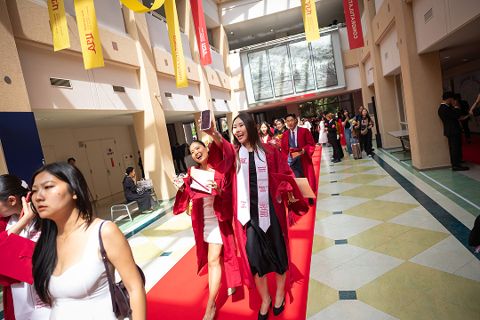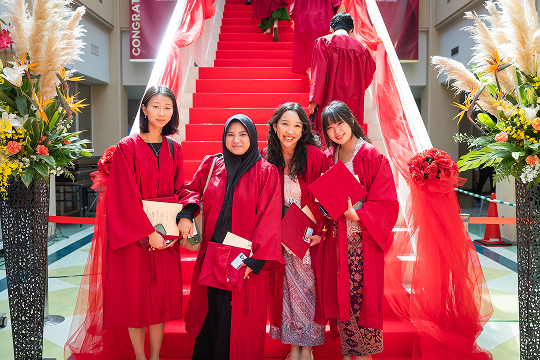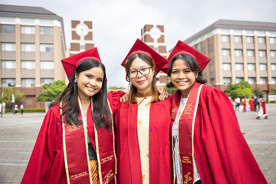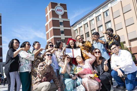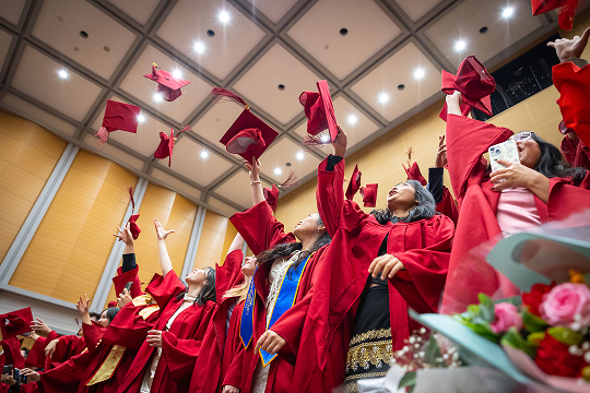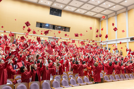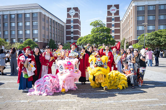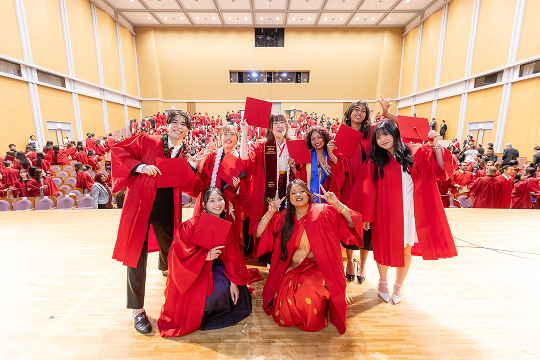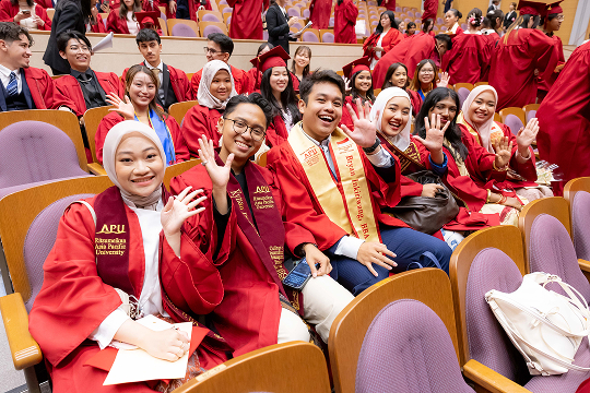 式典の後には、恒例の帽子投げが行われました。卒業生たちの“We are APU”の掛け声とともに、赤い学帽が一斉に空高く舞い上がりました。笑顔あふれる卒業生たちは、それぞれの未来へ向けて新たな一歩を踏み出しました。