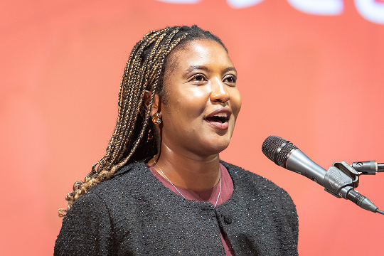 来賓から、校友会代表で国際連合人権高等弁務官事務局に勤めるMorse Caoagas Floresさん(アジア太平洋学部 2006年卒、フィリピン)の祝辞を、Weineza Celineさん(アジア太平洋学部 2022年卒、ルワンダ)が代読されました。