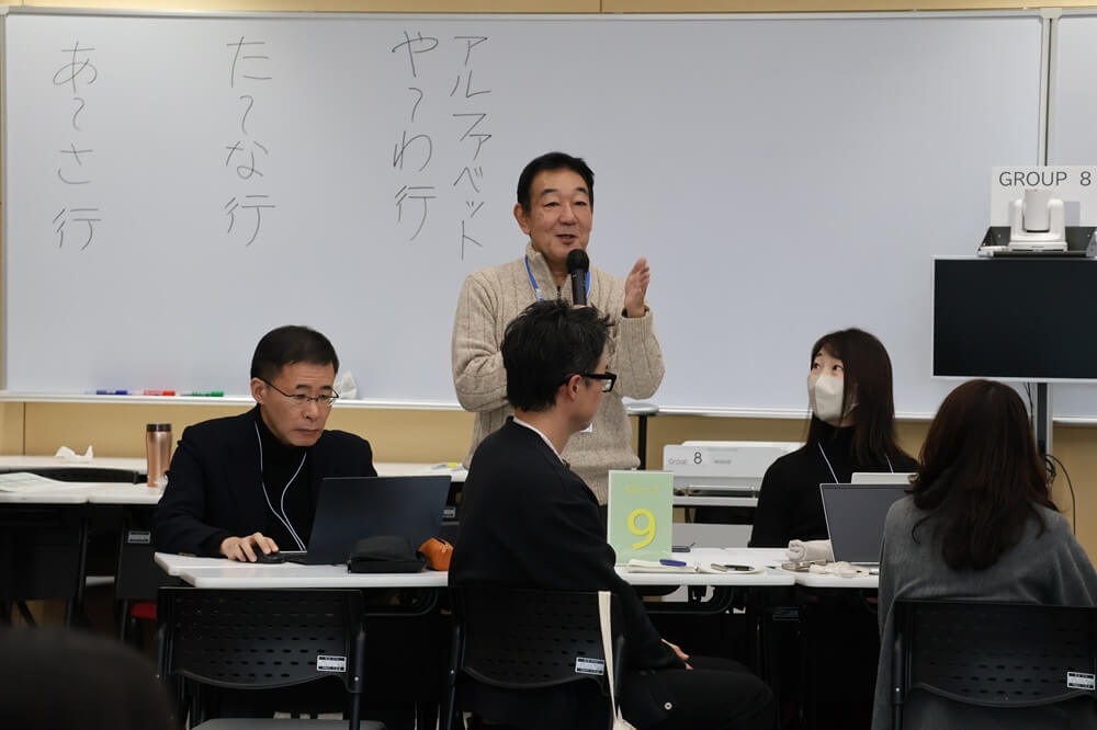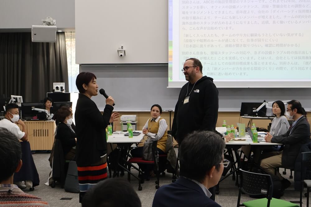 第二部は、理論の応用編として、多様性から生じる問題をテーマにしたケーススタディが行われ、各グループの代表が異文化感受性の発達段階をもとに実演し、メーカー氏がフィードバックを行いました。このワークを通じ、メーカー氏は組織における議論では、議論に参加する人の「発達的多様性」が影響を与えており、それを認識する重要性を強調しました。そのうえで、自分と他者の共通点や相違点を理解し、自らの関わり方を主体的に選択することを提案しました。第三部は、参加者の希望のテーマに基づき、コンサルテーションを実施しました。